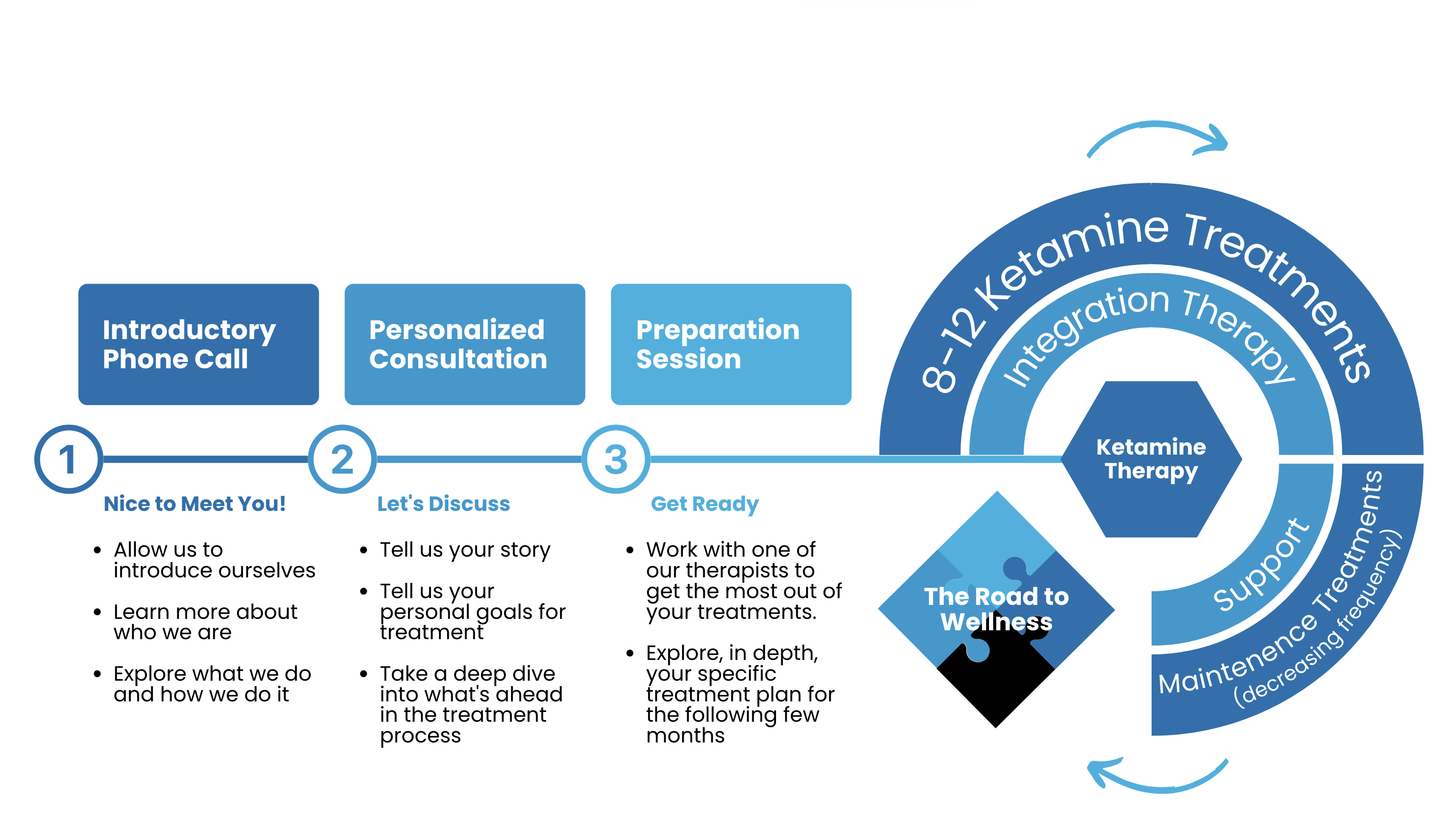 All patients begin by having a consultation with a MPH provider followed by a ketamine preparation session. Treatment plans typically begin with a period of weekly or bi-weekly ketamine treatment over the period of several weeks. This period is called initiation. Then during maintenance, you will receive a ketamine treatment every four to eight weeks on average. Our treatment team will then suggest other modalities to pair with ketamine that will help you keep these new thought patterns strong and healthy. This process usually takes somewhere between six months to two years.